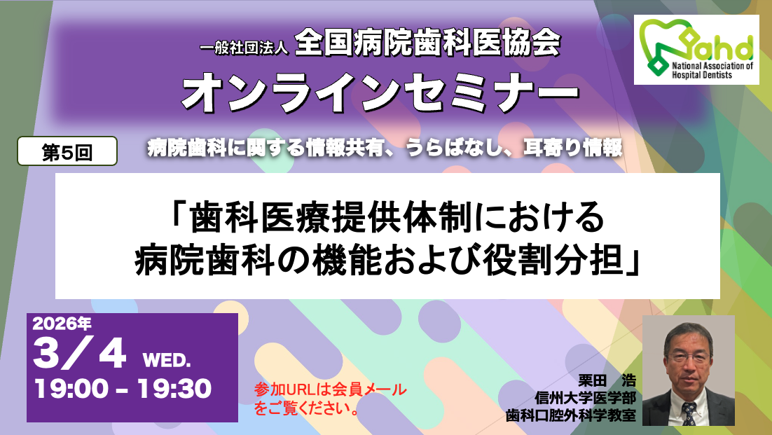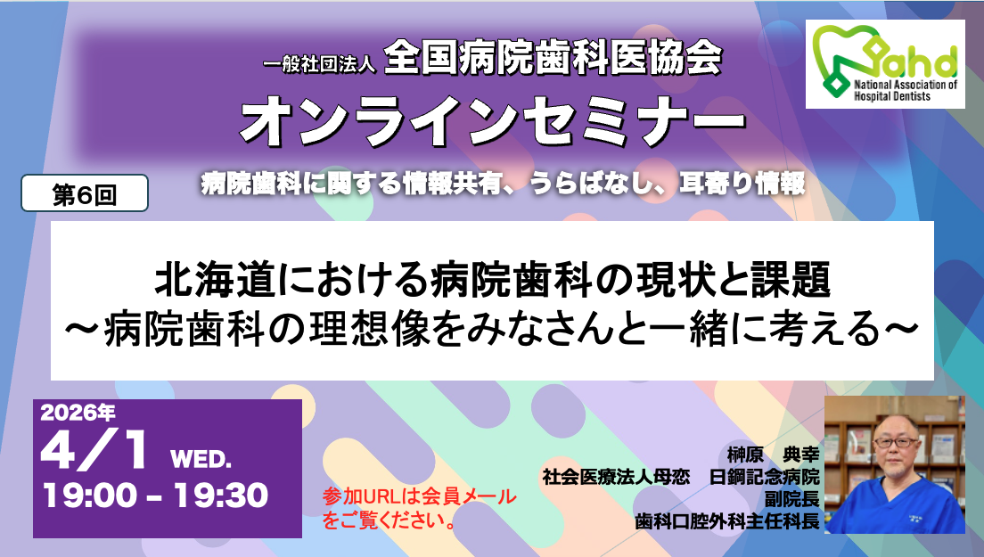 最終的に病院歯科の発展と使命の完遂により、歯科口腔医療の確保と質の向上を図り、もって国民及び地域社会の健全な発展に寄与することを願うものです。